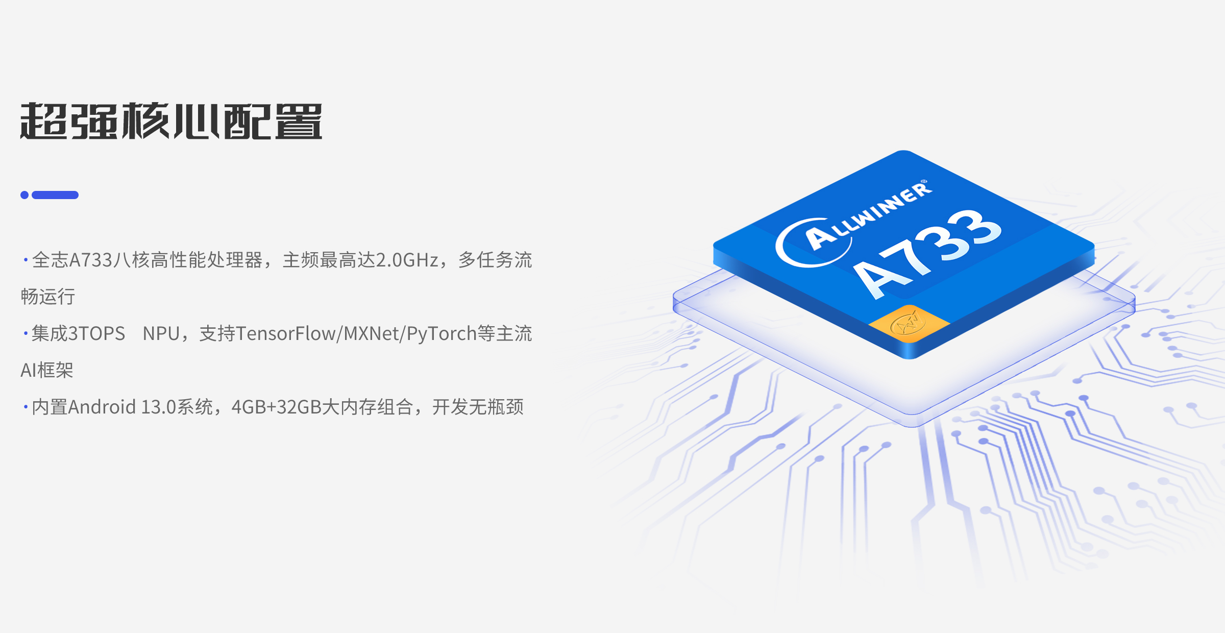 CPU:全志A733八核处理器,主频最高达2.0GHz NPU:3TOPS算力 操作系统:Android13.0系统 内存:标配4G 存储:标配32G |