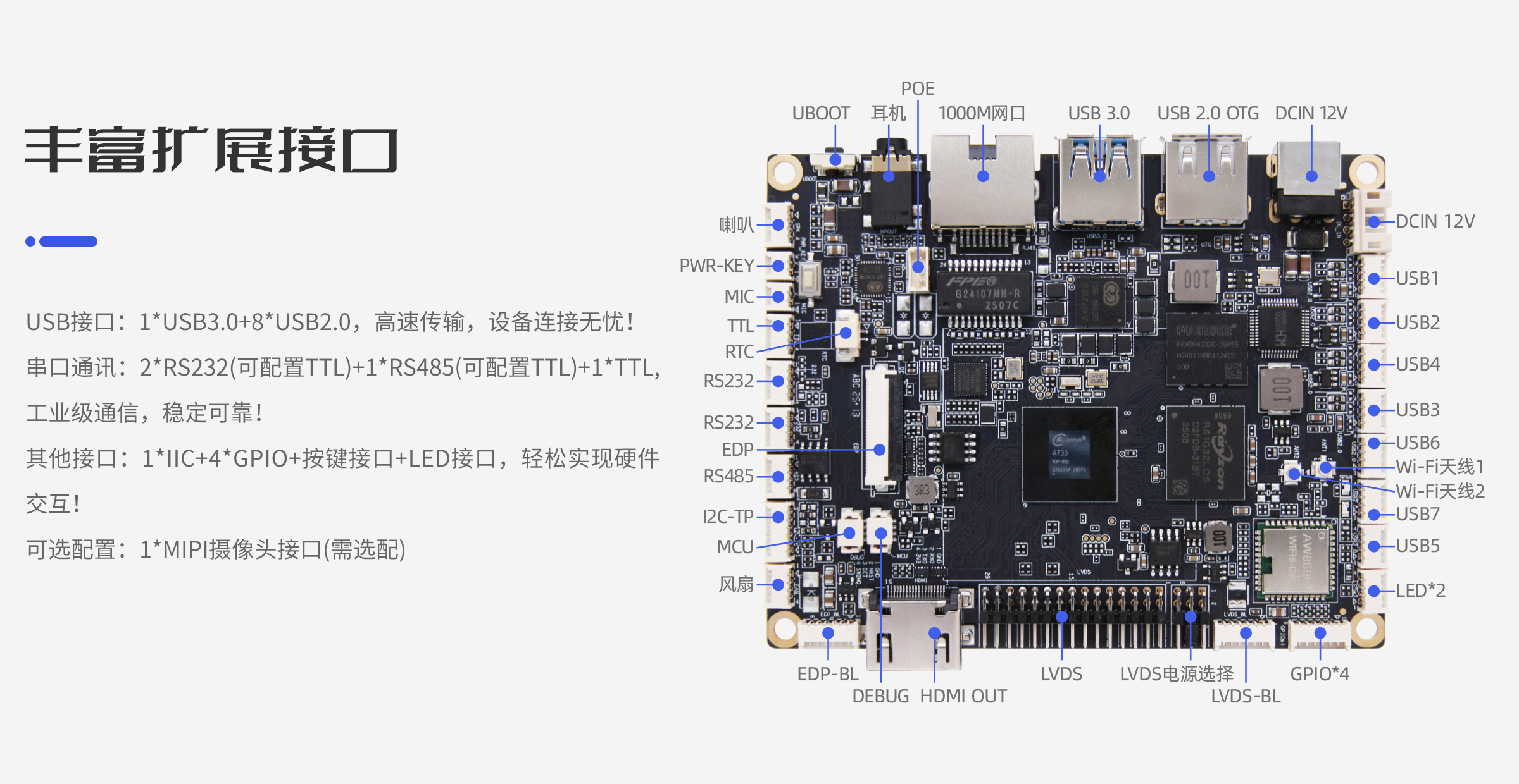 USB:9路(1路USB3.0 HOST,8路USB2.0 HOST) 串口:1路TTL,2路RS232(可配置成TTL),1路RS485(可配置成TTL),4个GPIO,按键接口,LED接口,1路MIPI摄像头(可选) IIC:1路,可接I2C接口的TP或外设 |
