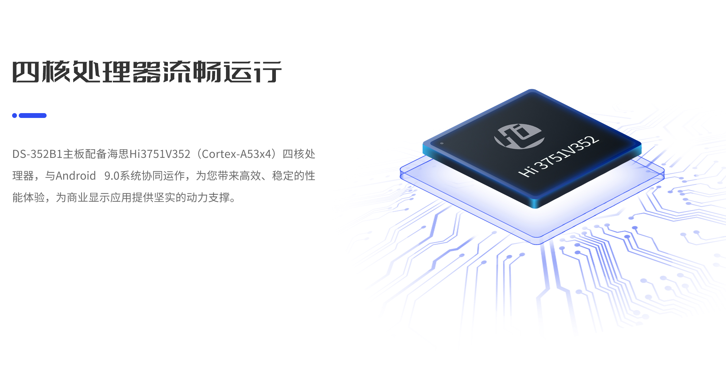 CPU:海思Hi3751V352(Cortex-A53x4)四核处理器,主频最高可达1GHz 操作系统:Android9.0系统 内存:最大支持1G 存储:最大支持64G |