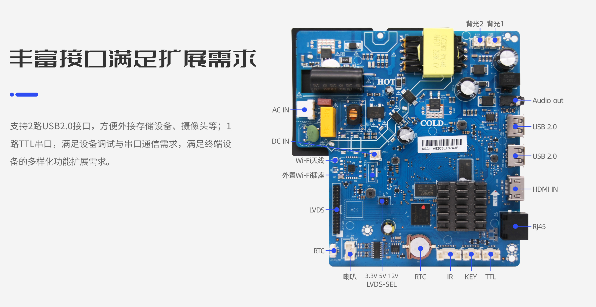 尺寸:137.5*146mm RTC:支持RTC实时时钟 系统升级: 支持本地USB 升级 电源/遥控:12V 3A/支持遥控器 |