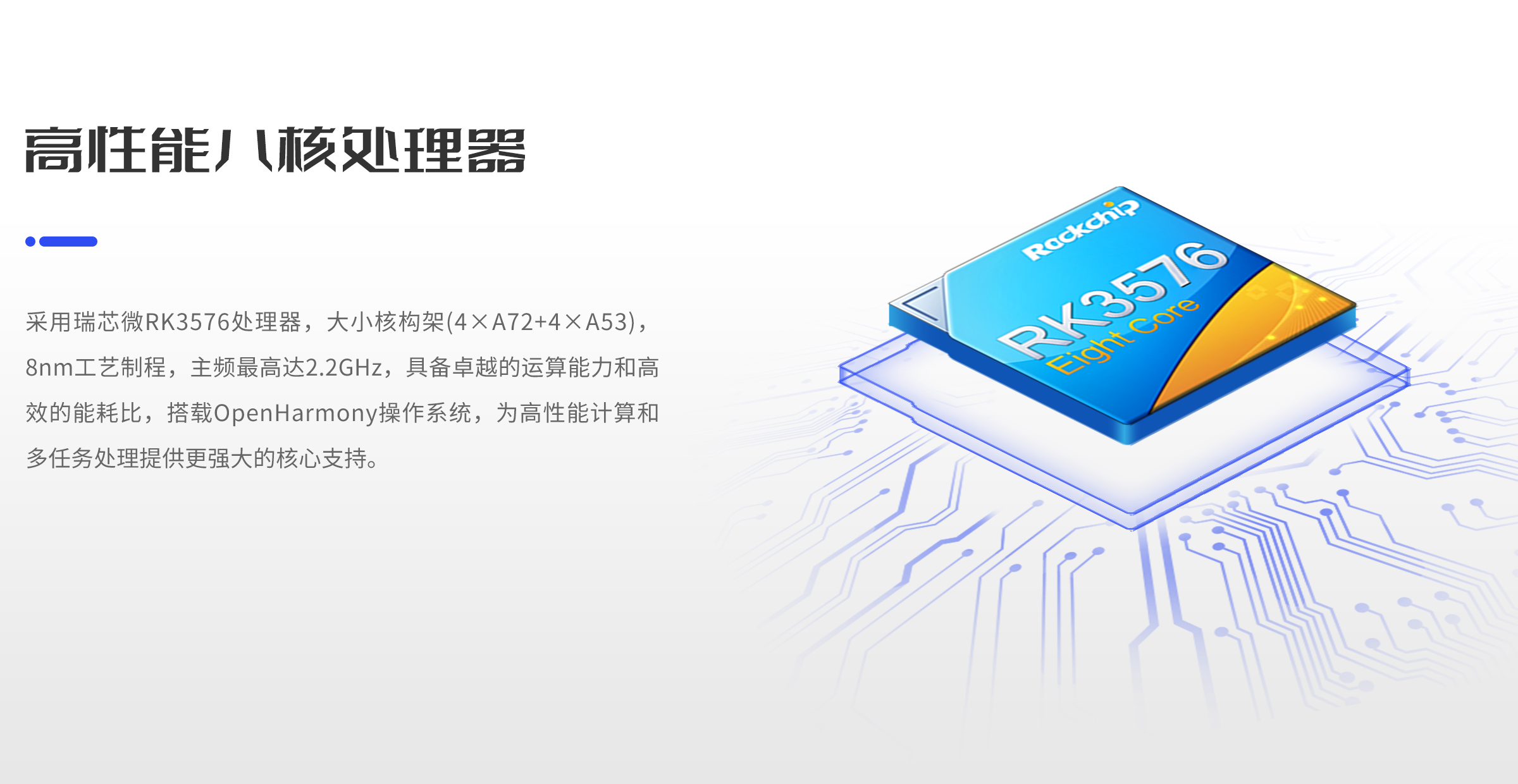 CPU:RK3576八核处理器,主频最高达2.2GHz NPU:6TOPS算力 操作系统:OpenHarmony系统 内存:标配4G 存储:标配32G |